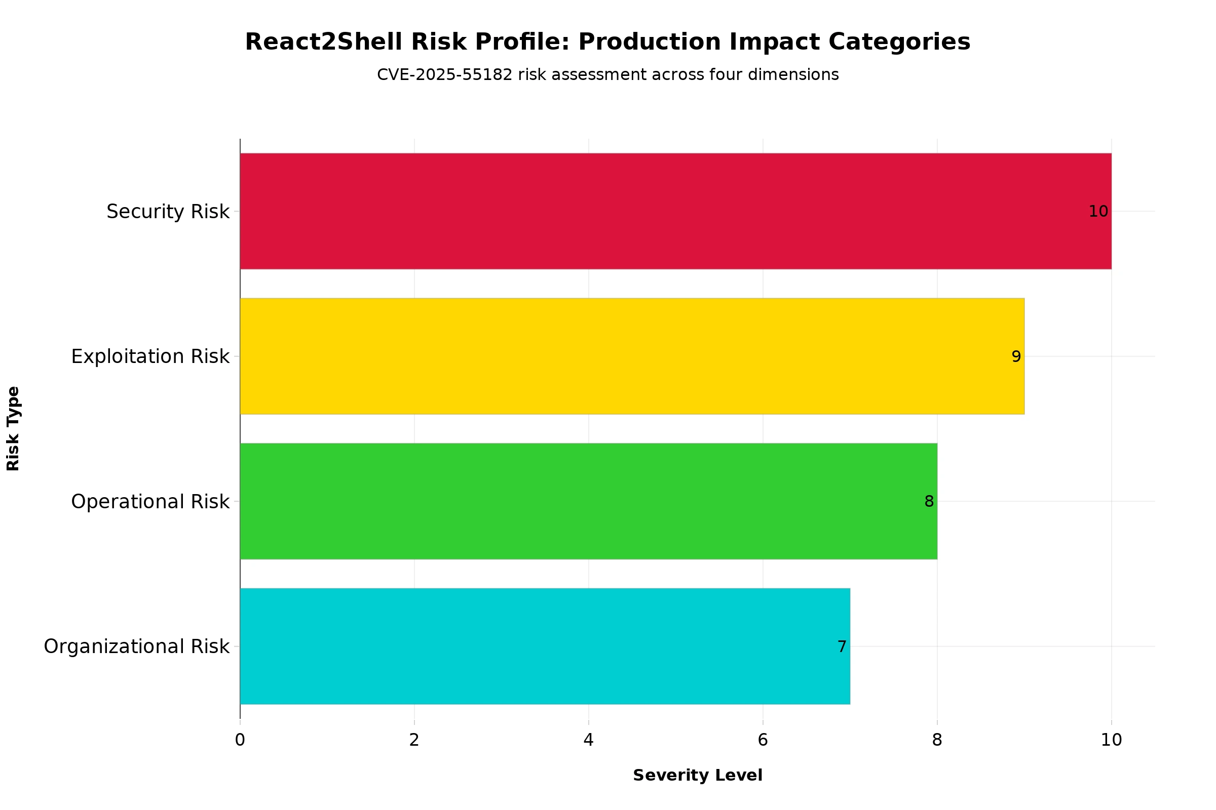 Figure 1: React2Shell risk profile showing the severity of four production impact categories, from critical security vulnerability to organizational readiness gaps